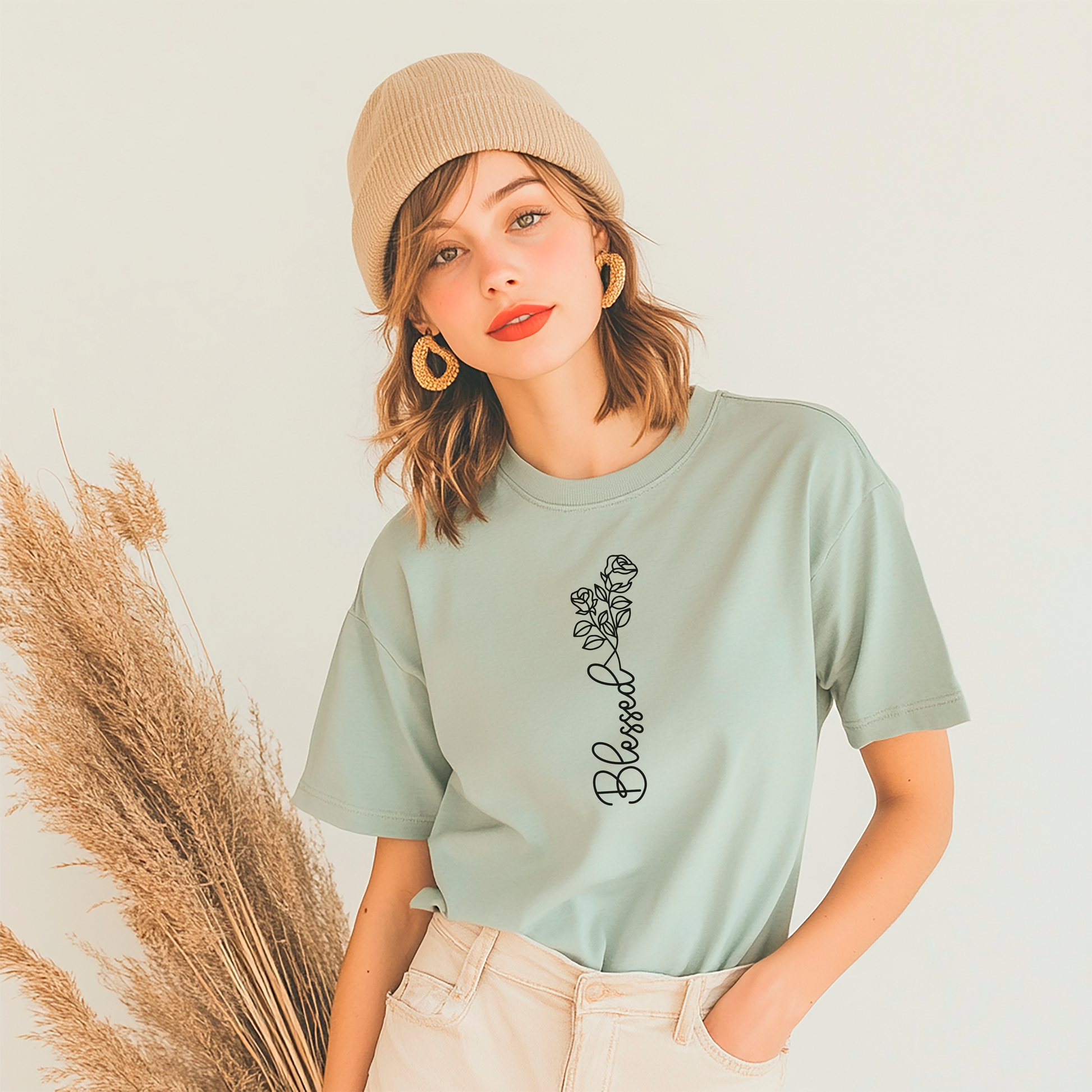 Blessed Script Rose T-shirt | Floral Line Art Tee